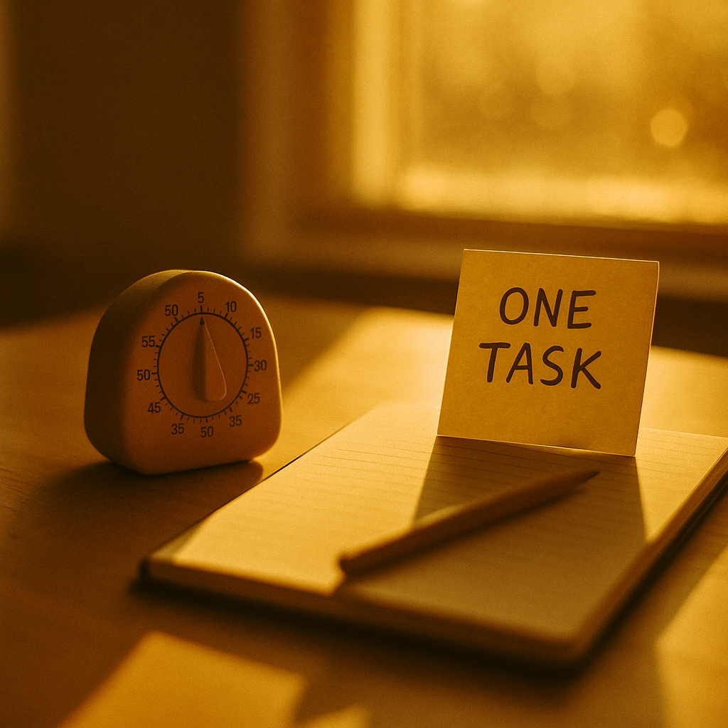 25-minute deep-work blocks with a single-task rule and quick end review. Less noise, more done.